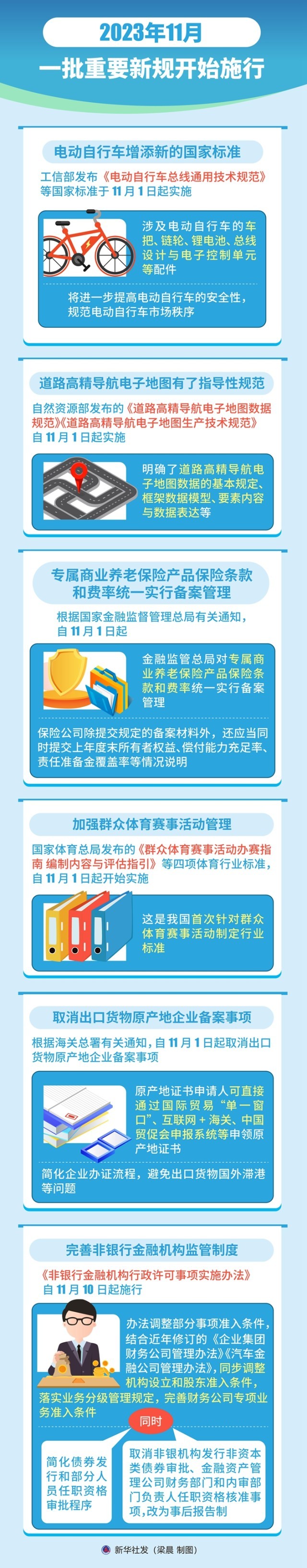 電動自行車增添新國標,為(wei) 用戶提供更多安全保障;道路高精導航電子地圖有了指導性規範,讓自駕出行更加高效便捷;完善專(zhuan) 屬商業(ye) 養(yang) 老保險產(chan) 品管理製度,守好居民“養(yang) 老錢”……一批重要新規11月開始施行。一起看看,哪條你最關(guan) 心?