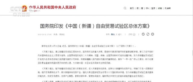 央視網消息:昨天(10月31日),國務院印發《中國(新疆)自由貿易試驗區總體(ti) 方案》,提出賦予新疆自貿試驗區更大改革自主權,深入開展差別化探索,培育壯大新疆特色優(you) 勢產(chan) 業(ye) 等政策,明確了提升貿易便利化水平、強化與(yu) 周邊國家經貿合作等25個(ge) 方麵的具體(ti) 舉(ju) 措。自2013年中國首個(ge) 自貿試驗區在上海掛牌,此次新設新疆自貿試驗區已經是自貿試驗區第七次擴容。