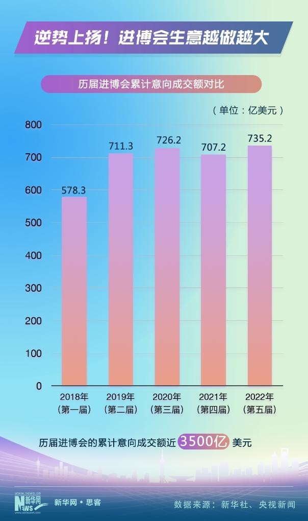 2018年11月,首屆進博會(hui) 在上海“初試啼聲”。之後,進博會(hui) 不顧風雨和險阻,年年如約而至、越辦越好。數據顯示,進博會(hui) 的累計意向成交額從(cong) 2018年的578.3億(yi) 美元,上升到2022年的735.2億(yi) 美元。前五屆進博會(hui) 的累計意向成交額近3500億(yi) 美元。進博會(hui) 生意越做越大。