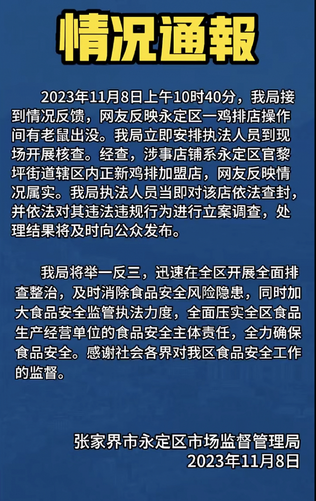 官方通報“張家界景區小吃店老鼠紮堆亂竄”:屬實,涉事正新雞排加盟店已被查封