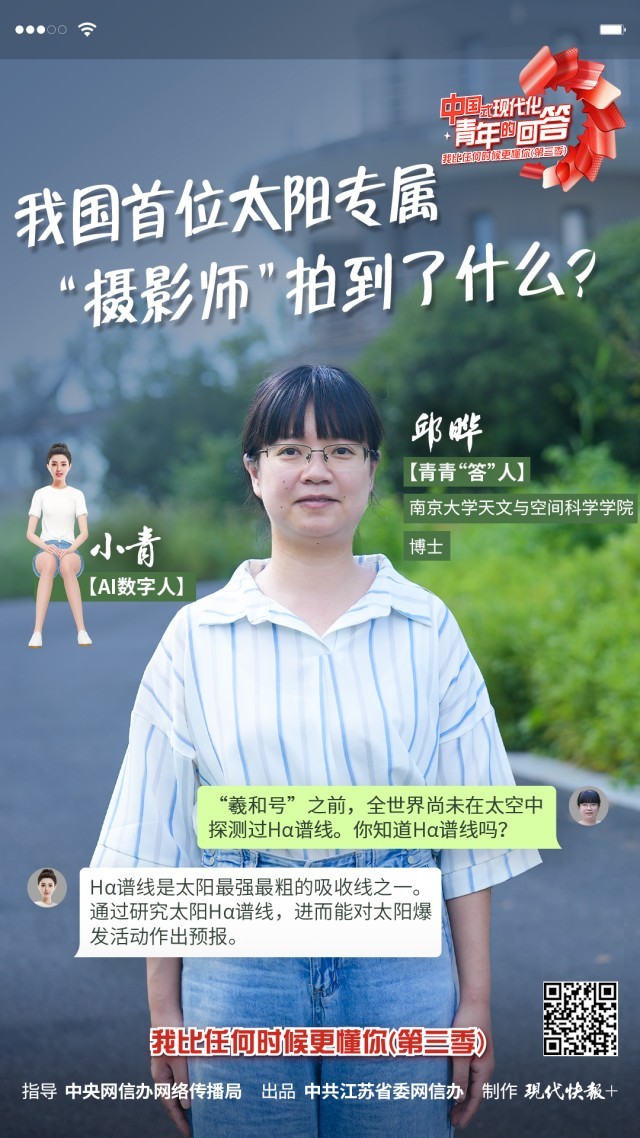 11月7日,“中國式現代化·青年的回答——我比任何時候更懂你(第三季)”係列短視頻之《我國首位太陽專(zhuan) 屬“攝影師”拍到了什麽(me) ?》正式上線。本集視頻中,青青“答”人——南京大學天文與(yu) 空間科學學院博士邱曄和AI數字人小青,為(wei) 大家展示了我國首顆探日衛星“羲和號”拍攝到的畫麵,解釋了“羲和號”超長全稱裏的兩(liang) 個(ge) 關(guan) 鍵詞的含義(yi) 。