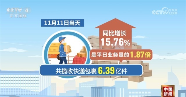 數據顯示,11月1日至11日,全國郵政快遞企業(ye) 共攬收快遞包裹52.64億(yi) 件,同比增長23.22%,日均業(ye) 務量是平日業(ye) 務量的1.4倍。其中11月11日當天,共攬收快遞包裹6.39億(yi) 件,是平日業(ye) 務量的1.87倍,同比增長15.76%。