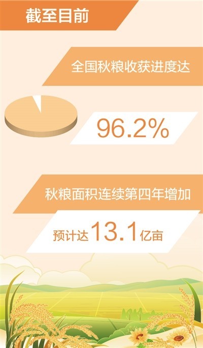 本報北京11月11日電 (記者鬱靜嫻)農(nong) 業(ye) 農(nong) 村部最新農(nong) 情調度顯示:伴隨玉米大豆及中稻收獲進入尾聲、南方晚稻收獲加速推進,全國秋糧收獲進度達96.2%,基本實現豐(feng) 收到手。今年以來,我國糧食生產(chan) 克服局部地區洪澇幹旱等災害影響,全年糧食產(chan) 量有望再創新高。
