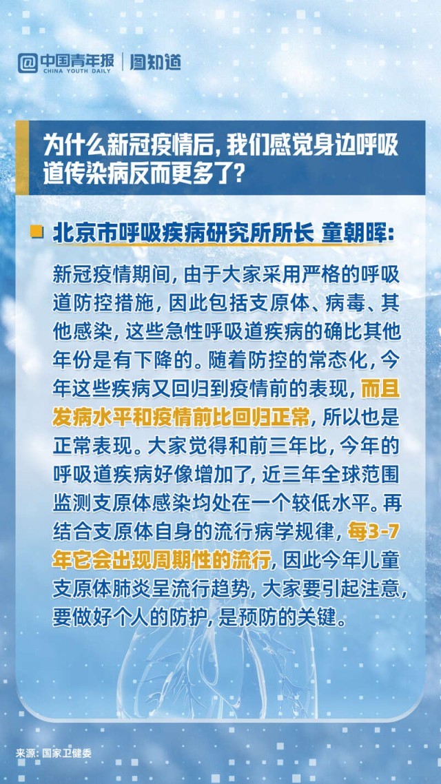 肺炎支原體(ti) 感染和普通流感有什麽(me) 區別?今年肺炎支原體(ti) 感染有何特點?為(wei) 什麽(me) 新冠疫情後,我們(men) 感覺身邊呼吸道傳(chuan) 染病反而更多了?目前我國新冠形勢究竟如何?時值冬季,新冠病毒是否會(hui) 出現再次變異?多重病毒疊加混合感染後如何治療?今天下午,國家衛健委就冬季呼吸道疾病防治有關(guan) 情況回答了熱點提問。