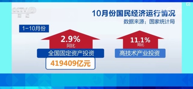 從(cong) 投資看,固定資產(chan) 投資規模繼續擴大。1—10月份,全國固定資產(chan) 投資419409億(yi) 元,同比增長2.9%。其中,高技術產(chan) 業(ye) 投資同比增長11.1%,為(wei) 新動能的成長壯大打下了較好基礎。