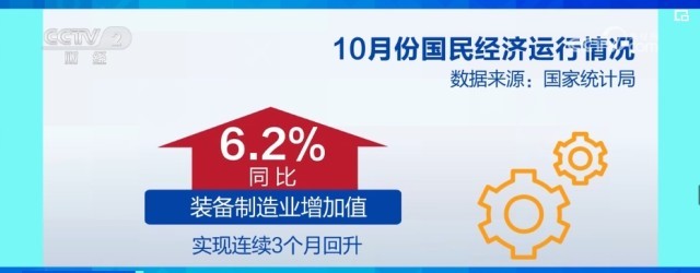 10月份,全國規模以上工業(ye) 增加值比上月加快0.1個(ge) 百分點。其中,裝備製造業(ye) 增加值同比增長6.2%,比上月加快0.7個(ge) 百分點,連續3個(ge) 月回升。