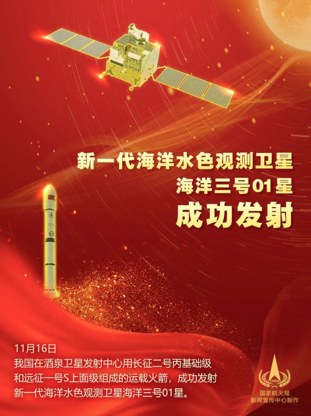 中國青年報客戶端北京11月16日電(張未 王豪 李儀(yi) 中青報·中青網記者 邱晨輝)北京時間11月16日11時55分,我國在酒泉衛星發射中心用長征二號丙基礎級和遠征一號S上麵級組成的運載火箭,成功發射新一代海洋水色觀測衛星海洋三號01星。該衛星指標達到國際水色遙感衛星先進水平,可滿足我國海洋環境監測的主體(ti) 業(ye) 務需求,並能夠服務於(yu) 生態文明建設、智慧海洋工程建設、“一帶一路”倡議等國家重大戰略需求。