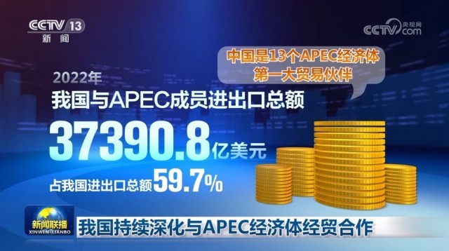 央視網消息(新聞聯播):商務部最新數據顯示,2022年,我國與(yu) APEC成員進出口總額為(wei) 37390.8億(yi) 美元,占我國進出口總額的59.7%。中國是13個(ge) APEC經濟體(ti) 的第一大貿易夥(huo) 伴。