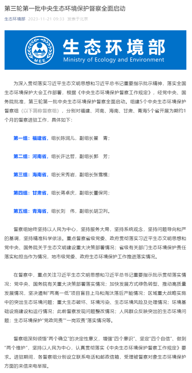 央視網消息:據生態環境部消息,為(wei) 深入貫徹落實習(xi) 近平生態文明思想和習(xi) 近平總書(shu) 記重要指示批示精神,落實全國生態環境保護大會(hui) 工作部署,根據《中央生態環境保護督察工作規定》,經黨(dang) 中央、國務院批準,第三輪第一批中央生態環境保護督察全麵啟動。組建5個(ge) 中央生態環境保護督察組(以下簡稱督察組),分別對福建、河南、海南、甘肅、青海5個(ge) 省開展為(wei) 期約1個(ge) 月的督察進駐工作,具體(ti) 如下: