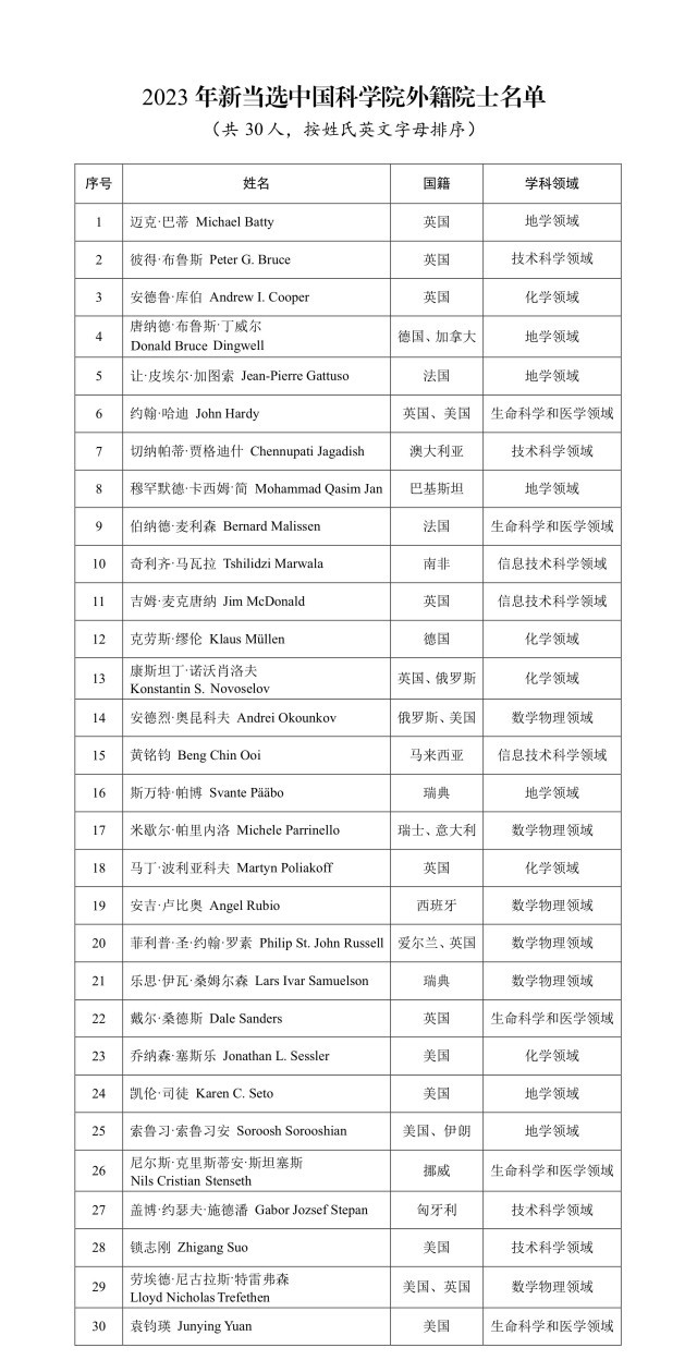 中國科學院2023年當選外籍院士名單。中國科學院官網圖