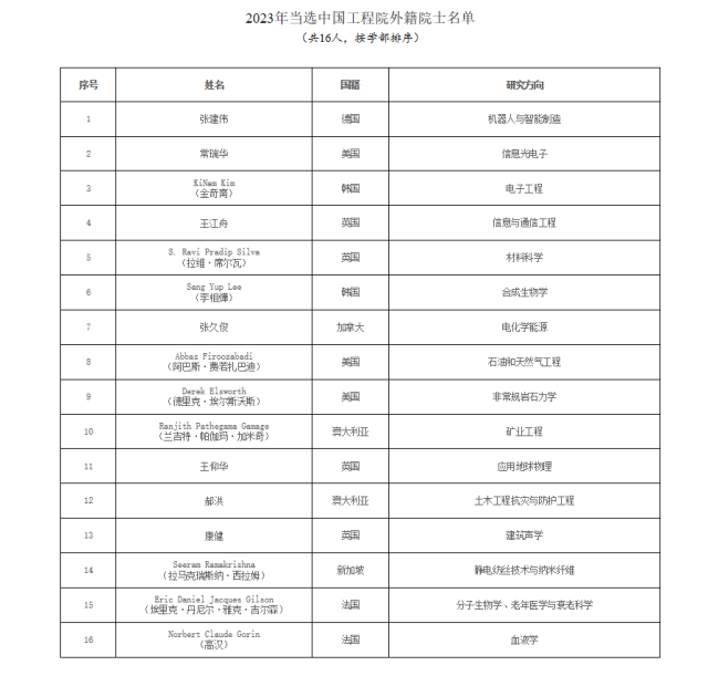 中國工程院2023年當選外籍院士名單。中國工程院官網圖