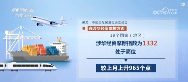 在涉華經貿摩擦方麵,19個(ge) 國家(地區)涉華經貿摩擦指數為(wei) 1332,處於(yu) 高位,較上月上升965個(ge) 點。