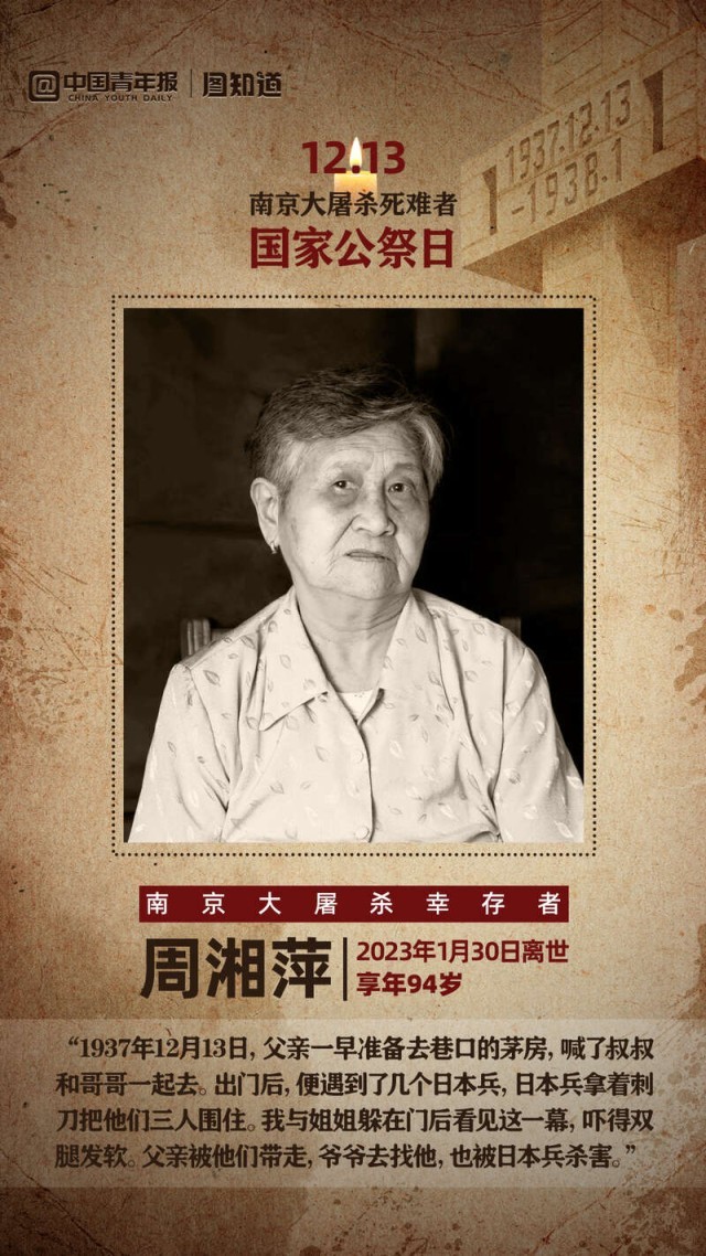 在侵華日軍(jun) 南京大屠殺遇難同胞紀念館,有一麵南京大屠殺幸存者照片牆。每有一位登記在冊(ce) 的幸存者離世,就會(hui) 熄滅一盞燈。但是,他們(men) 在生前通過口述等方式將曆史記憶留給了我們(men) 。一個(ge) 個(ge) 體(ti) 的生命可能有盡頭,但一個(ge) 國家、一個(ge) 民族的記憶將代代相傳(chuan) 。今天是南京大屠殺死難者國家公祭日,共同走近這些老人,他們(men) 離去了,但我們(men) 可以點亮一盞名為(wei) 記憶的燈。