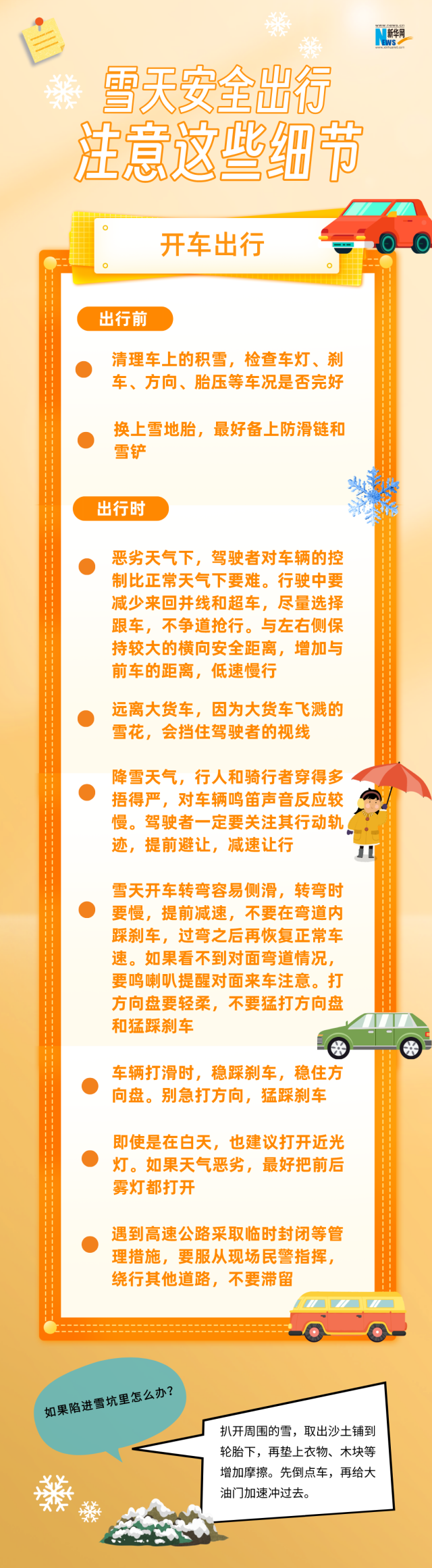 下雪天外出,無論是步行還是騎車、開車,都要小心謹慎,避免發生事故。