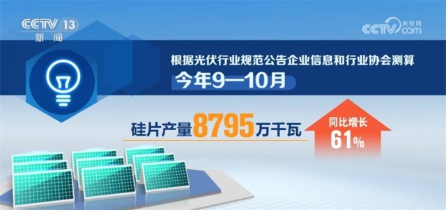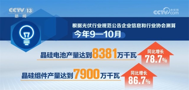 央視網消息:工業(ye) 和信息化部昨天(12月13日)發布當前全國光伏製造行業(ye) 最新運行情況。數據顯示,今年9—10月,我國光伏製造業(ye) 保持高位運行,矽料、矽片、電池、組件產(chan) 量同比增長均超60%。