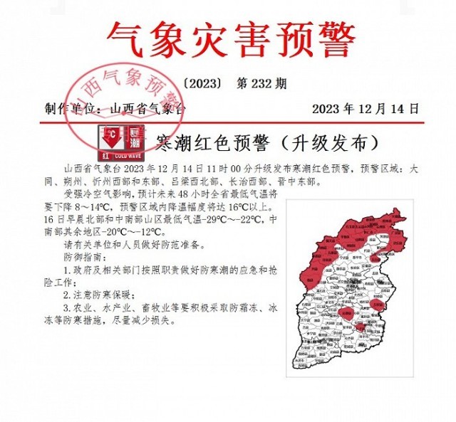 山西省氣象台升級發布寒潮紅色預警