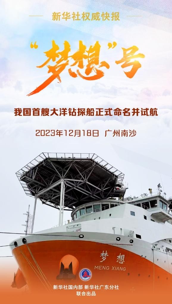 12月18日,我國自主設計建造的首艘大洋鑽探船正式命名為(wei) “夢想”號,並在廣州南沙首次試航。