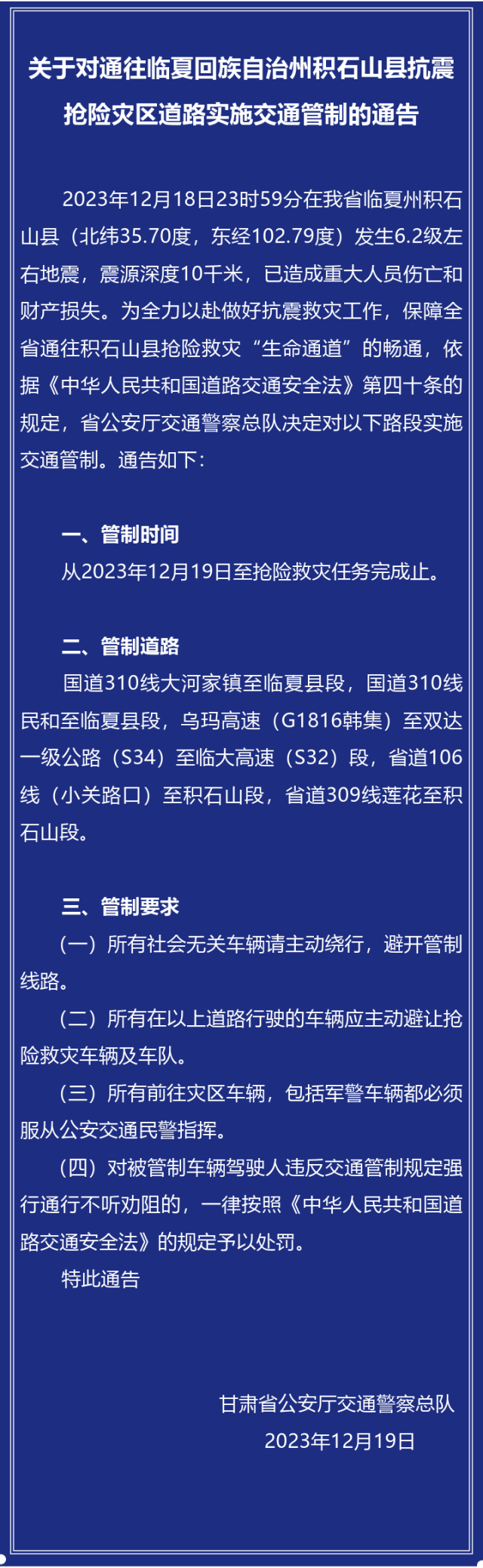 2023年12月18日23時59分在甘肅省臨(lin) 夏州積石山縣發生6.2級左右地震,已造成重大人員傷(shang) 亡和財產(chan) 損失。為(wei) 全力以赴做好抗震救災工作,保障甘肅全省通往積石山縣搶險救災“生命通道”的暢通,甘肅省公安廳交通警察總隊對抗震搶險災區道路實施交通管製,至搶險救災任務完成止,詳情如下: