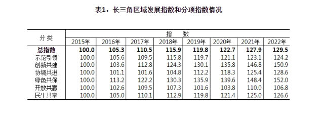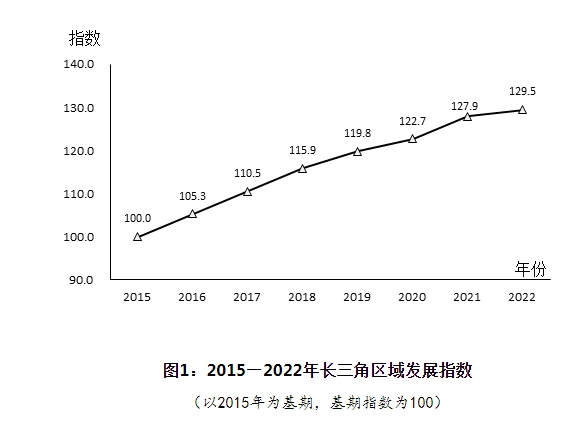 從(cong) 測算結果看,以2015年為(wei) 基期,2022年長三角區域發展指數為(wei) 129.5,比上年提高1.6,年均提高4.2。