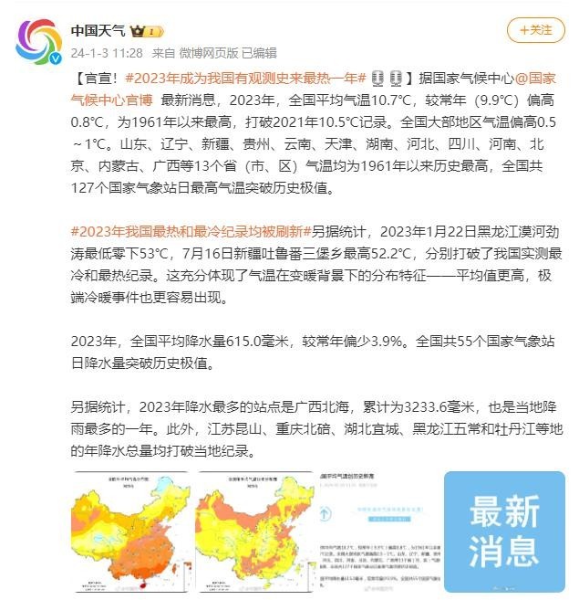央視網消息:中國天氣 援引國家氣候中心國家氣候中心官博 最新消息,2023年,全國平均氣溫10.7℃,較常年(9.9℃)偏高0.8℃,為(wei) 1961年以來最高,打破2021年10.5℃記錄。全國大部地區氣溫偏高0.5~1℃。山東(dong) 、遼寧、新疆、貴州、雲(yun) 南、天津、湖南、河北、四川、河南、北京、內(nei) 蒙古、廣西等13個(ge) 省(市、區)氣溫均為(wei) 1961年以來曆史最高,全國共127個(ge) 國家氣象站日最高氣溫突破曆史極值。