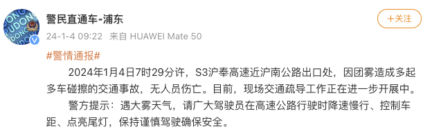 央視網消息:據警民直通車-浦東(dong) 通報,1月4日7時29分許,S3滬奉高速近滬南公路出口處,因團霧造成多起多車碰擦的交通事故,無人員傷(shang) 亡。目前,現場交通疏導工作正在進一步開展中。