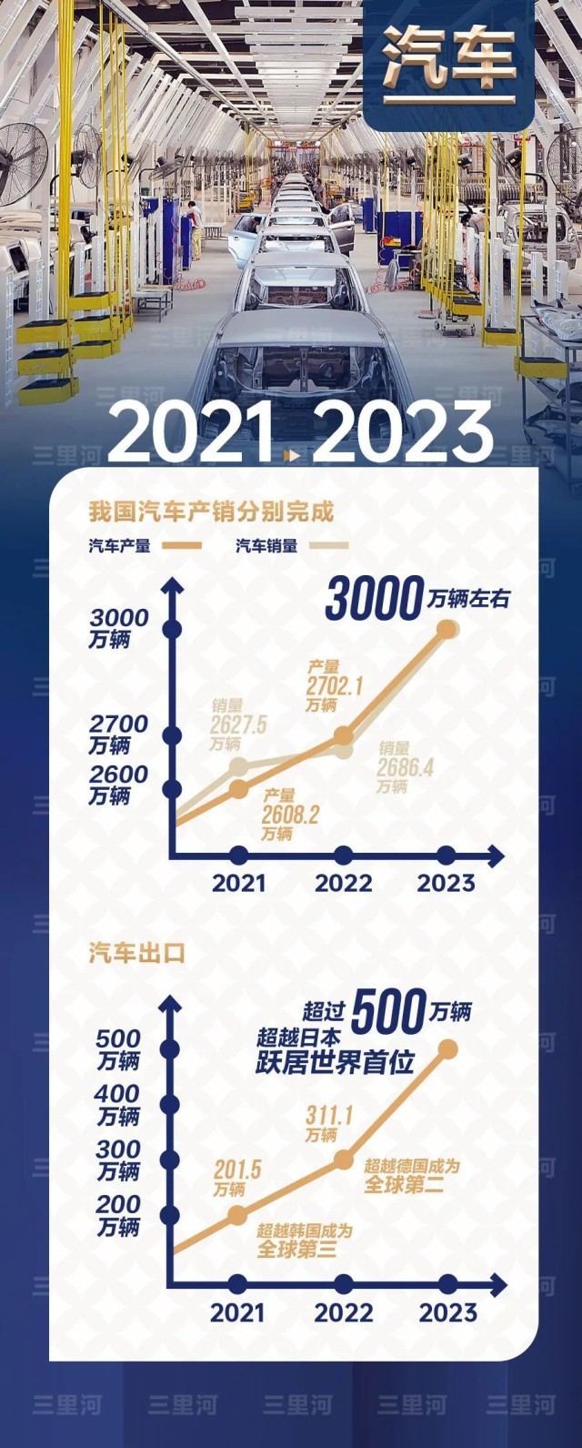 2023年,全年汽車產(chan) 銷量預計達3000萬(wan) 輛左右、創曆史新高,出口超過500萬(wan) 輛,超越日本,躍居世界首位。
