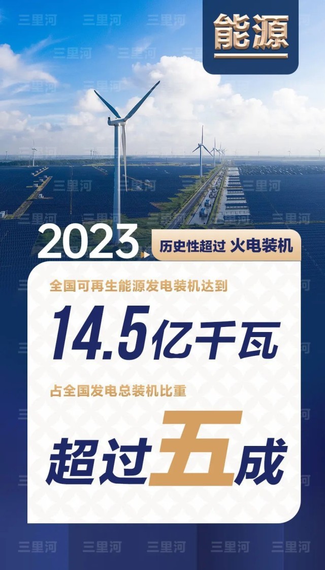 2023年,全國可再生能源發電裝機達到14.5億(yi) 千瓦,占全國發電總裝機比重超過五成,曆史性超過火電裝機。