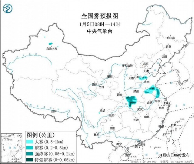 中央氣象台1月5日06時繼續發布大霧黃色預警