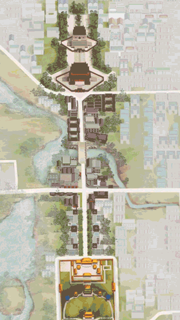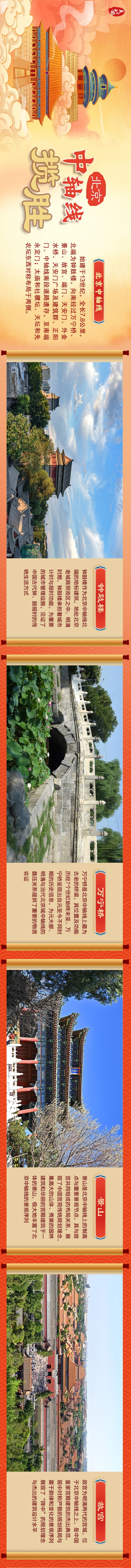 全長7.8公裏的北京中軸線北端為(wei) 鍾鼓樓,向南經過萬(wan) 寧橋、景山、故宮、端門、天安門、外金水橋、天安門廣場及建築群、正陽門、中軸線南段道路遺存,至南端永定門;太廟和社稷壇、天壇和先農(nong) 壇東(dong) 西對稱布局於(yu) 兩(liang) 側(ce) 。