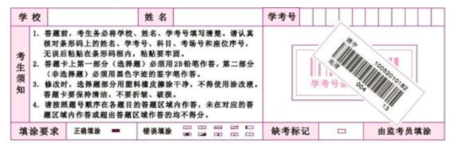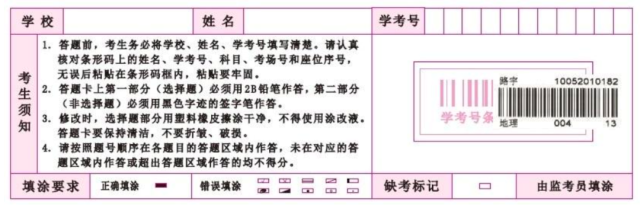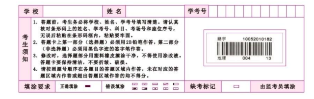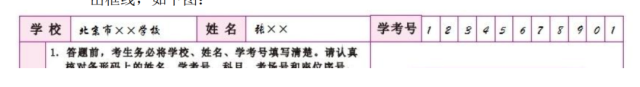 3.答題前要仔細閱讀答題卡上的“考生須知”。務必用黑色字跡的簽字筆將答題卡左上角的學校名稱、姓名、學考號填寫(xie) 清楚,字跡不能超出框線,如下圖: