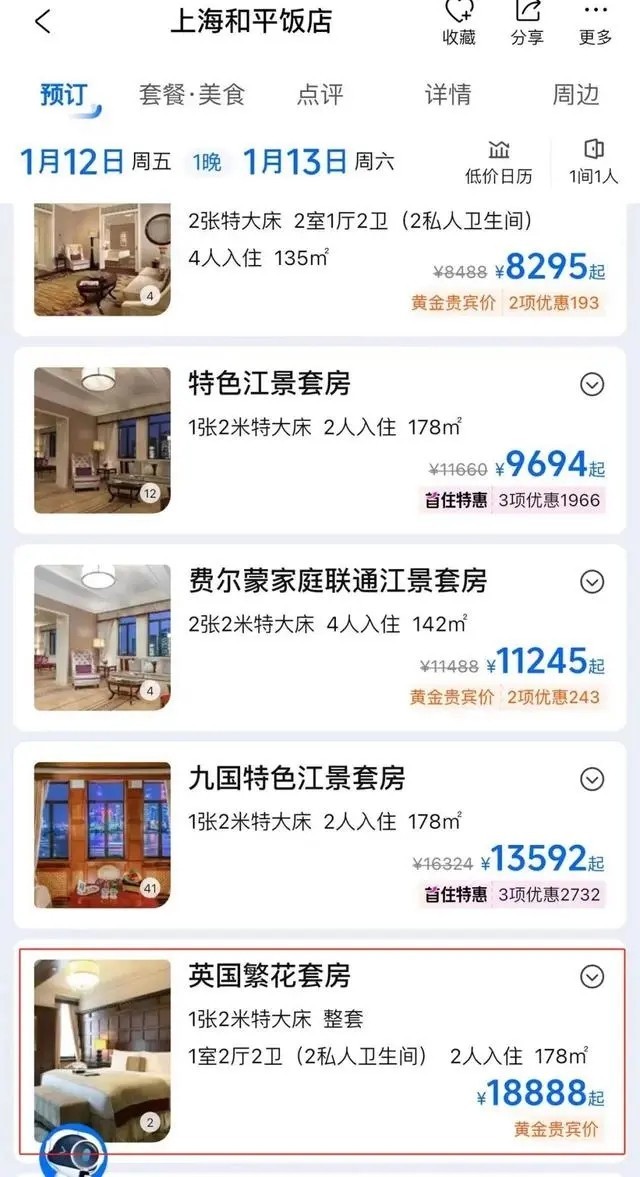 劇中出鏡率極高的和平飯店英國套房也成了“熱門產(chan) 品”。目前,和平飯店英國套房在旅遊平台上被命名為(wei) “英國繁花套房”。9日查詢攜程旅行平台發現,9-11日該套房已售罄,12日入住一晚的價(jia) 格為(wei) 18888元。據媒體(ti) 此前報道,這一套房在今年春節期間含早價(jia) 為(wei) 22888元一晚。