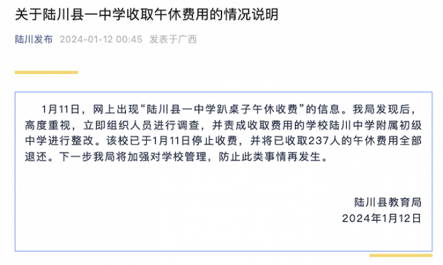 央視網消息:據“陸川發布”公眾(zhong) 號消息,1月12日,廣西陸川縣教育局通報關(guan) 於(yu) 一中學收取午休費用的情況說明:1月11日,網上出現“陸川縣一中學趴桌子午休收費”的信息,教育局立即組織人員進行調查,並責成收取費用的學校陸川中學附屬初級中學進行整改。該校已於(yu) 1月11日停止收費,並將已收取237人的午休費用全部退還。下一步將加強對學校管理,防止此類事情再發生。