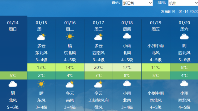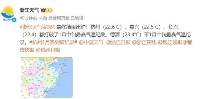 像是杭州,今天最高氣溫22.6℃,剛刷新當地1月中旬最高氣溫紀錄,明天氣溫陡降,雖預報最高氣溫14℃,但今晚開始氣溫倒出,實際明天下午最高氣溫將不足10℃,17日氣溫再度升至20℃,大幅偏高,20日又降至8℃。