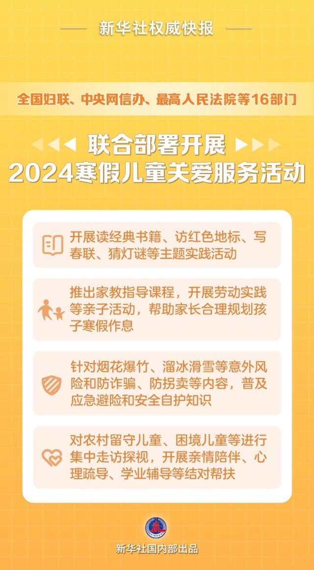寒假即將到來,全國婦聯、中央網信辦、最高人民法院、最高人民檢察院、教育部、公安部、民政部、司法部、國家衛生健康委、應急管理部、國家體(ti) 育總局、國家疾控局、國家消防救援局、全國總工會(hui) 、共青團中央、中國關(guan) 工委等16部門印發通知,圍繞思想引領潤童心、家教指導育童心、安全教育護童心、愛心媽媽暖童心四個(ge) 方麵,聯合部署開展“把愛帶回家——真情暖童心 相伴護成長”2024寒假兒(er) 童關(guan) 愛服務活動。