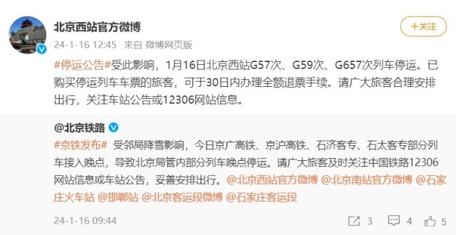 央視網消息:據@北京西站 微博消息,受中國鐵路北京局鄰局降雪影響,1月16日北京西站G57次、G59次、G657次列車停運。已購買(mai) 停運列車車票的旅客,可於(yu) 30日內(nei) 辦理全額退票手續,請廣大旅客合理安排出行,關(guan) 注車站公告或12306網站信息。