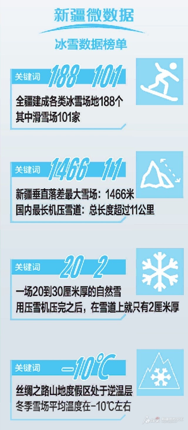 近年來,新疆冰雪旅遊蓬勃發展,最新數據顯示,全疆建成各類冰雪場地188個(ge) ,其中滑雪場101家。位於(yu) 冰雪黃金緯度帶,散落在天山、阿爾泰山的滑雪場,有一份亮眼的成績單:雪季最長、落差最大、雪道最多、景色最美……新疆極致冰雪體(ti) 驗背後那些不為(wei) 人知的故事,記者來為(wei) 你揭秘。