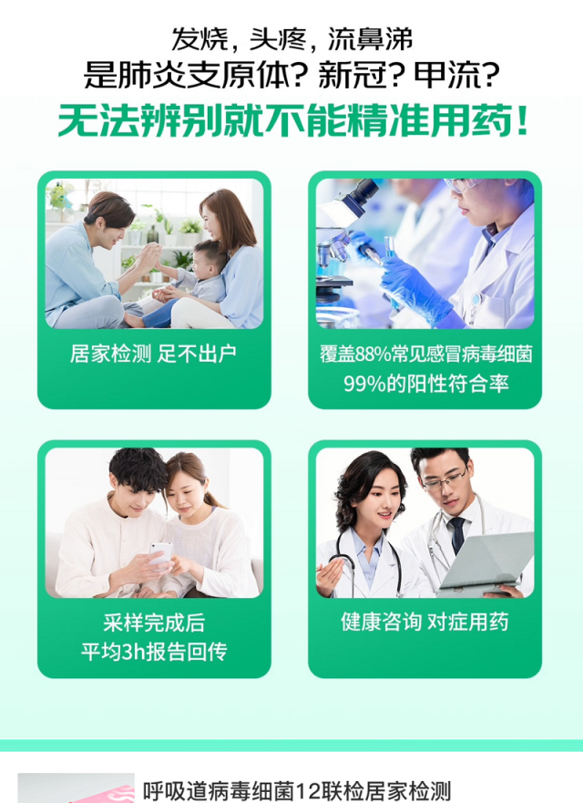 “一次檢測,覆蓋92種常見病原體(ti) 和11種耐藥基因……”相比之下,有機構推出的呼吸道病原體(ti) 居家檢測似乎更加“高大上”。從(cong) 介紹來看,檢測內(nei) 容包含甲流、乙流等30種RNA病毒、肺炎支原體(ti) 等5種非典型病原體(ti) 、煙曲黴等10種真菌、腺病毒等9種DNA病毒和百日咳鮑特菌等38種細菌,費用高達998元。