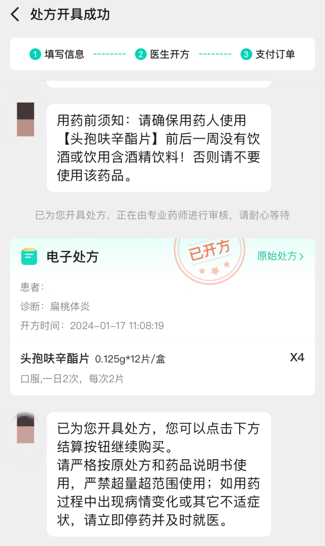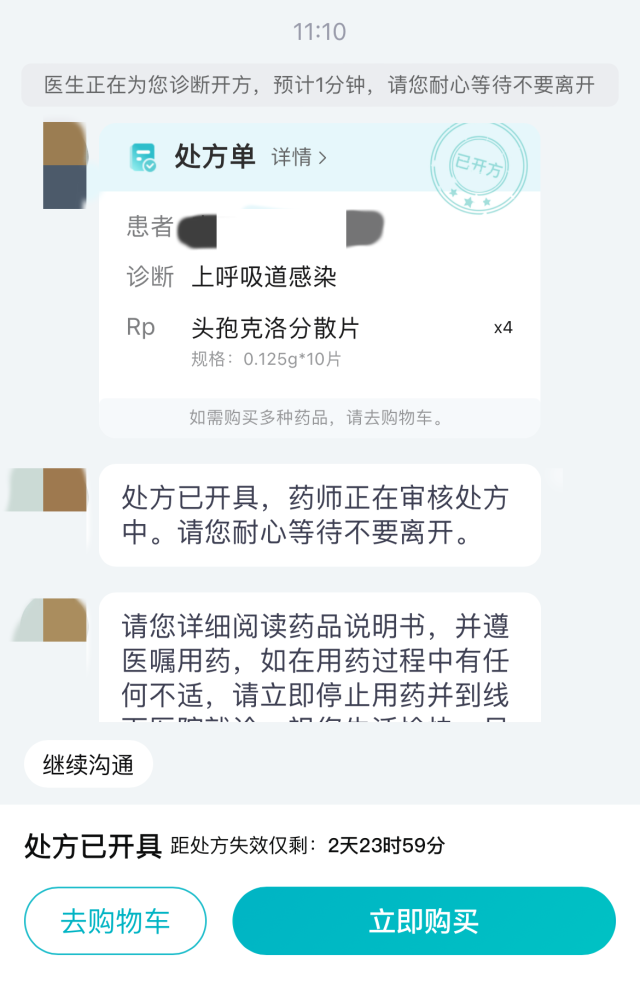 電商平台上,記者再次搜索頭孢類藥物,也隻需提交用藥人信息,選擇已確診疾病,確認後即可問診開方。點擊“無需補充,立即開方”,不到一分鍾,處方單便已生成。