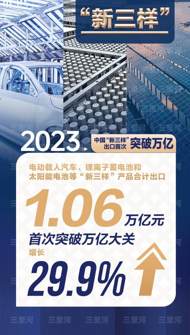 活力來自新動能——製造業(ye) 技改投資增長3.8%,高技術產(chan) 業(ye) 投資增長10.3%,快於(yu) 全部固定資產(chan) 投資的增速。2023年電動載人汽車、鋰電池和太陽能電池等“新三樣”產(chan) 品合計出口1.06萬(wan) 億(yi) 元,首次突破萬(wan) 億(yi) 大關(guan) 。中國經濟在加快培育新質生產(chan) 力中不斷發展壯大。