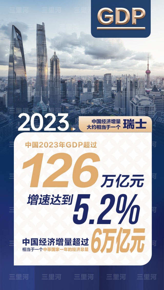 2023年中國經濟年報顯示,全年GDP超過126萬(wan) 億(yi) 元(人民幣,下同),增速達到5.2%。按照可比價(jia) 計算,2023年中國經濟增量超過6萬(wan) 億(yi) 元,相當於(yu) 一個(ge) 中等國家一年的經濟總量。