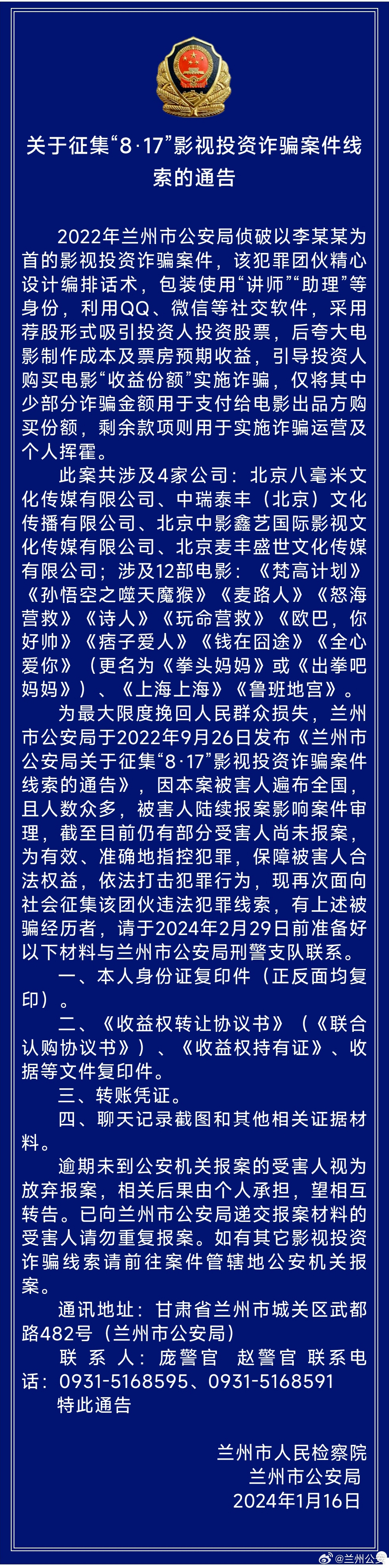 為(wei) 最大限度挽回人民群眾(zhong) 損失,蘭(lan) 州市公安局早在2022年9月26日發布《蘭(lan) 州市公安局關(guan) 於(yu) 征集“8·17”影視投資詐騙案件線索的通告》,但因本案被害人遍布全國,且人數眾(zhong) 多,受害人陸續報案影響案件審理,截至目前仍有部分受害人尚未報案。