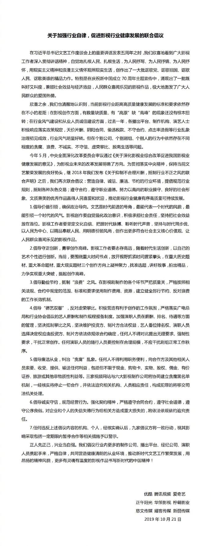 為(wei) 了避免娛樂(le) 圈的爭(zheng) 番、攀比等亂(luan) 象,業(ye) 界公司曾聯合發布自律倡議。2019年,優(you) 酷、騰訊視頻、愛奇藝三家視頻網站,聯合正午陽光、華策影視、檸萌影業(ye) 、慈文傳(chuan) 媒、耀客傳(chuan) 媒、新麗(li) 傳(chuan) 媒六大影視製作公司,共同發布《關(guan) 於(yu) 加強行業(ye) 自律,促進影視行業(ye) 健康發展的聯合倡議》。