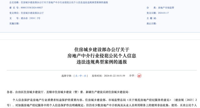 1月22日上午,住建部官網通報了5起房地產(chan) 中介行業(ye) 侵犯公民個(ge) 人信息違法違規典型案例: