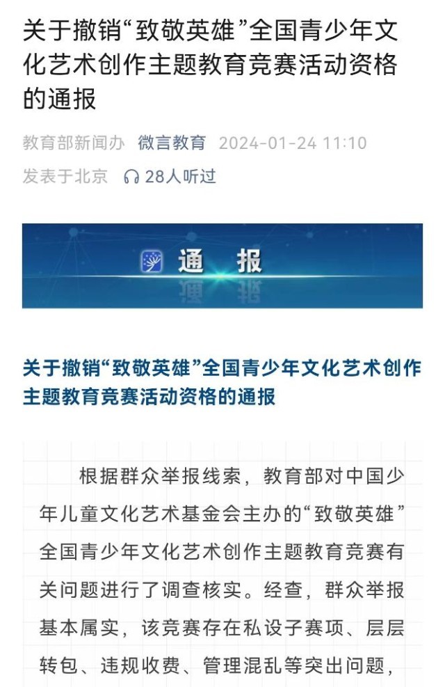 教育部1月24日通報,根據群眾(zhong) 舉(ju) 報線索,教育部對中國少年兒(er) 童文化藝術基金會(hui) 主辦的“致敬英雄”全國青少年文化藝術創作主題教育競賽有關(guan) 問題進行了調查核實。經查,群眾(zhong) 舉(ju) 報基本屬實,該競賽存在私設子賽項、層層轉包、違規收費、管理混亂(luan) 等突出問題,在社會(hui) 上造成了惡劣影響。