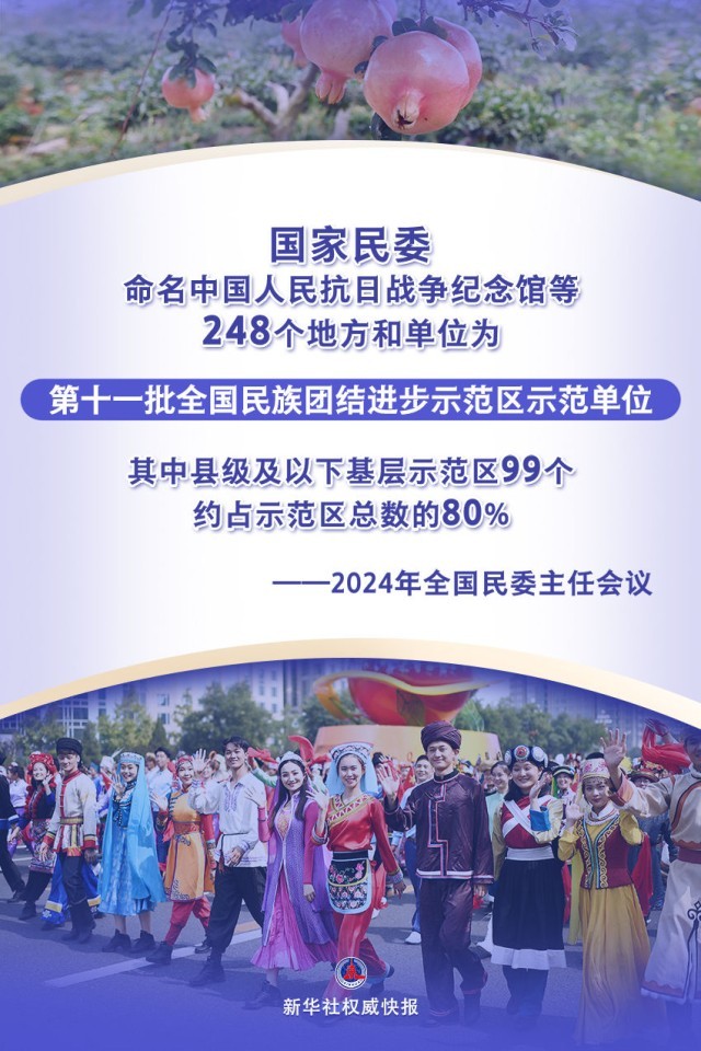記者從(cong) 1月23日召開的全國民委主任會(hui) 議上獲悉,248個(ge) 地方和單位被命名為(wei) 第十一批全國民族團結進步示範區示範單位,其中縣級及以下基層示範區99個(ge) ,約占示範區總數的80%。示範創建對象覆蓋麵廣、優(you) 中選優(you) ,鑄牢中華民族共同體(ti) 意識工作實績突出、示範意義(yi) 顯著。