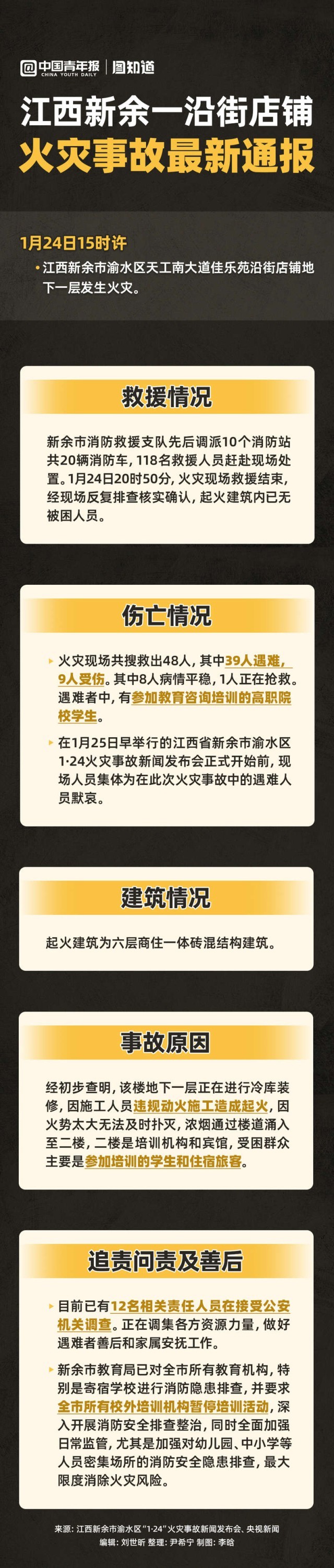 1月25日8時,江西省新餘(yu) 市渝水區“1·24”火災事故新聞發布會(hui) 通報,渝水區一沿街店鋪發生火災,造成39人遇難,9人受傷(shang) 。遇難者中,有參加教育谘詢培訓的高職院校學生。經初步查明,事故原因係施工人員違規動火施工造成起火。目前,已有12名相關(guan) 責任人員接受公安機關(guan) 調查。此外,新餘(yu) 市要求全市所有校外培訓機構暫停培訓活動,深入開展消防安全排查整治。