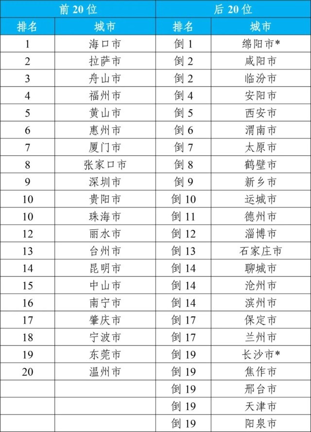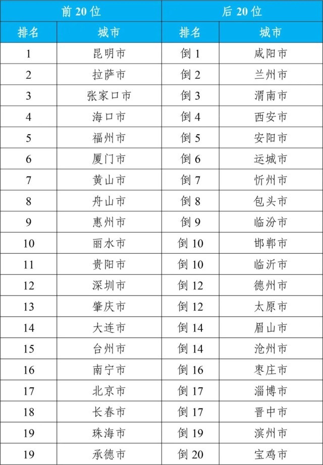 12月,168個(ge) 重點城市中:空氣質量排名前20位城市依次是昆明、拉薩和張家口等城市(從(cong) 第1名至並列第19名);空氣質量排名後20位城市依次是鹹陽、蘭(lan) 州和渭南等城市(從(cong) 倒數第1名至倒數第20名)。見附表1。