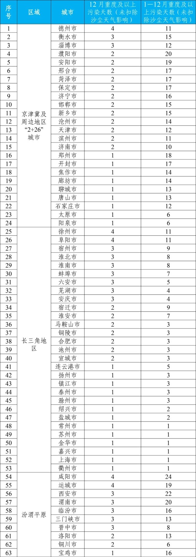 12月和1—12月重點區域出現重度及以上汙染天的城市及具體(ti) 天數詳見附表4。