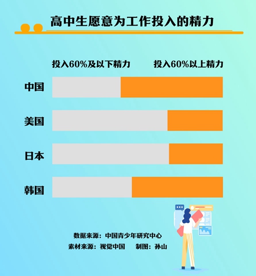 對於(yu) 未來的工作,受訪高中生願意投入多少精力?調查發現,假設全部精力是100%,願意為(wei) 工作投入80%以上精力的中國高中生占比16.2%,願意投入60%到80%精力的高中生占比43.8%,合計有六成受訪中國高中生願意為(wei) 工作投入60%以上精力,在四國受訪高中生中最高,其次是韓國高中生(53.3%),美國和日本高中生願意投入60%以上精力的比例均隻有三成多(32.4%和31.6%)。可見,中國和韓國高中生更願意投入較多精力在工作上。