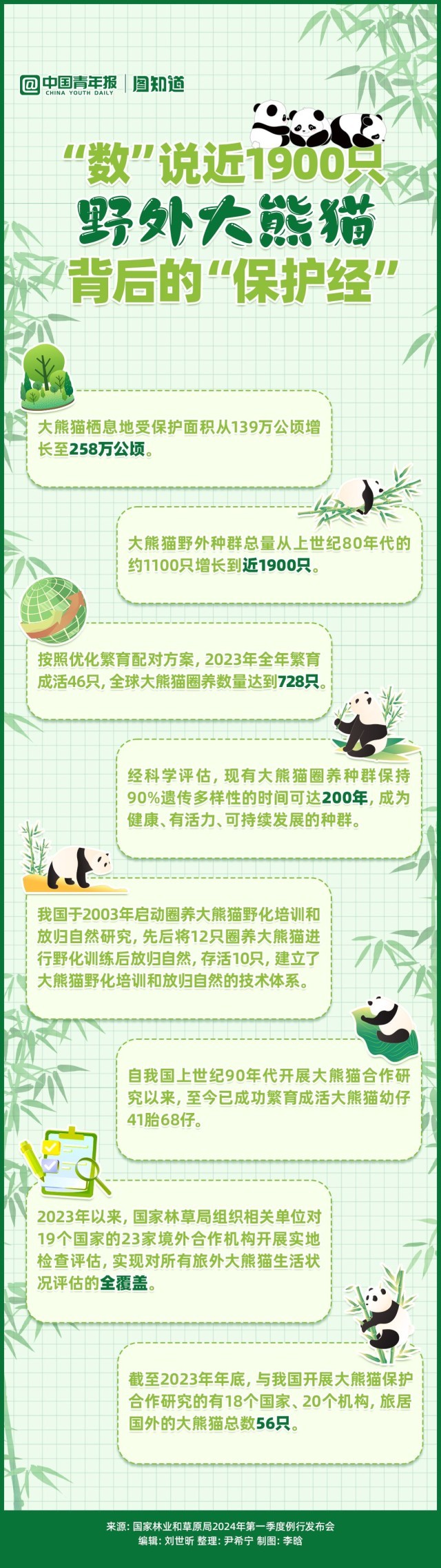 由“瀕危”到“易危”,我國為(wei) “國寶”大熊貓做了哪些保護工作?國家林業(ye) 和草原局2024年第一季度例行發布會(hui) 通報,現有大熊貓圈養(yang) 種群保持90%遺傳(chuan) 多樣性的時間可達200年。此外,我國已實現對所有旅外大熊貓生活狀況評估的全覆蓋。跟著數據,一起了解可愛“四腳獸(shou) ”背後的“保護經”。